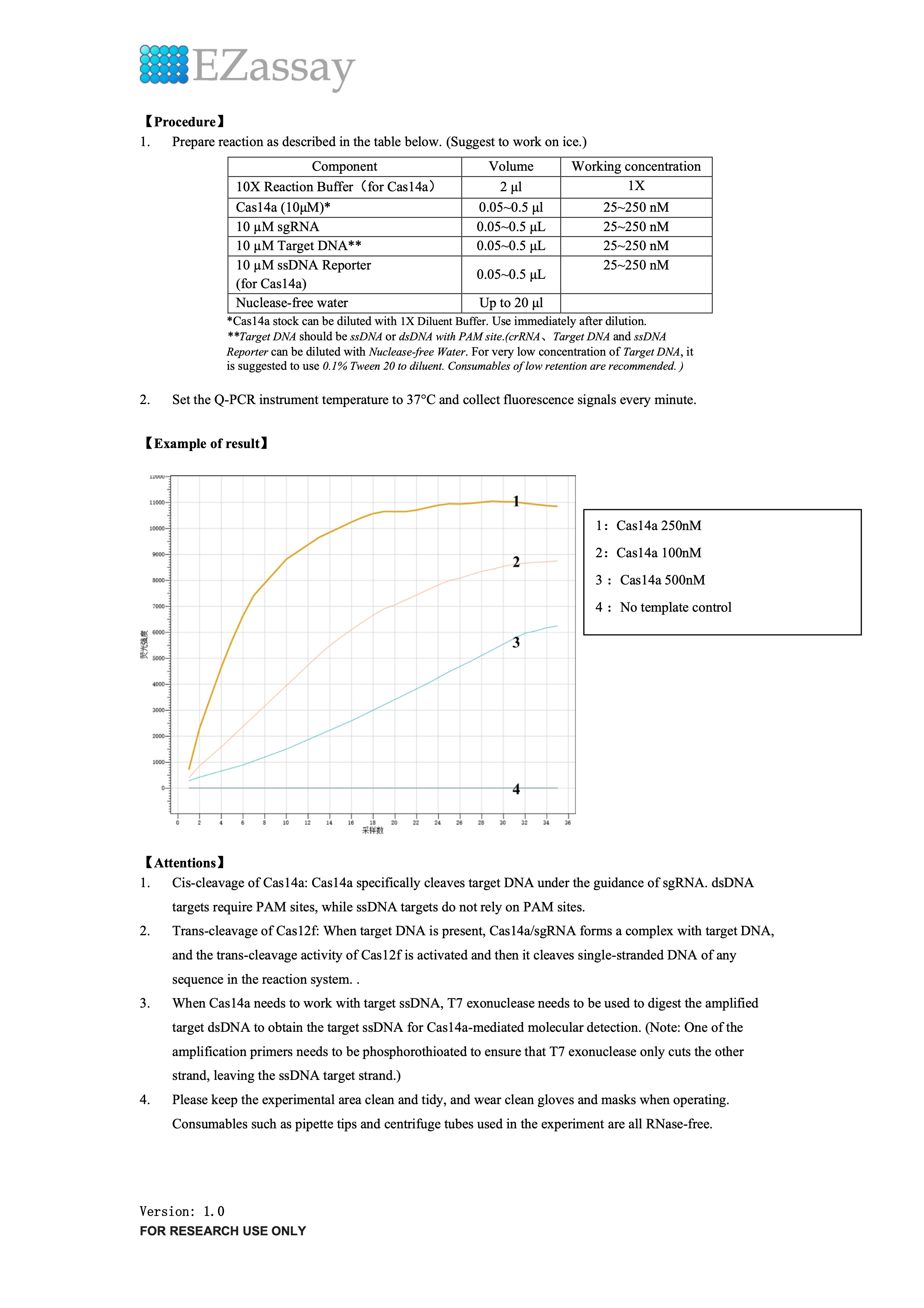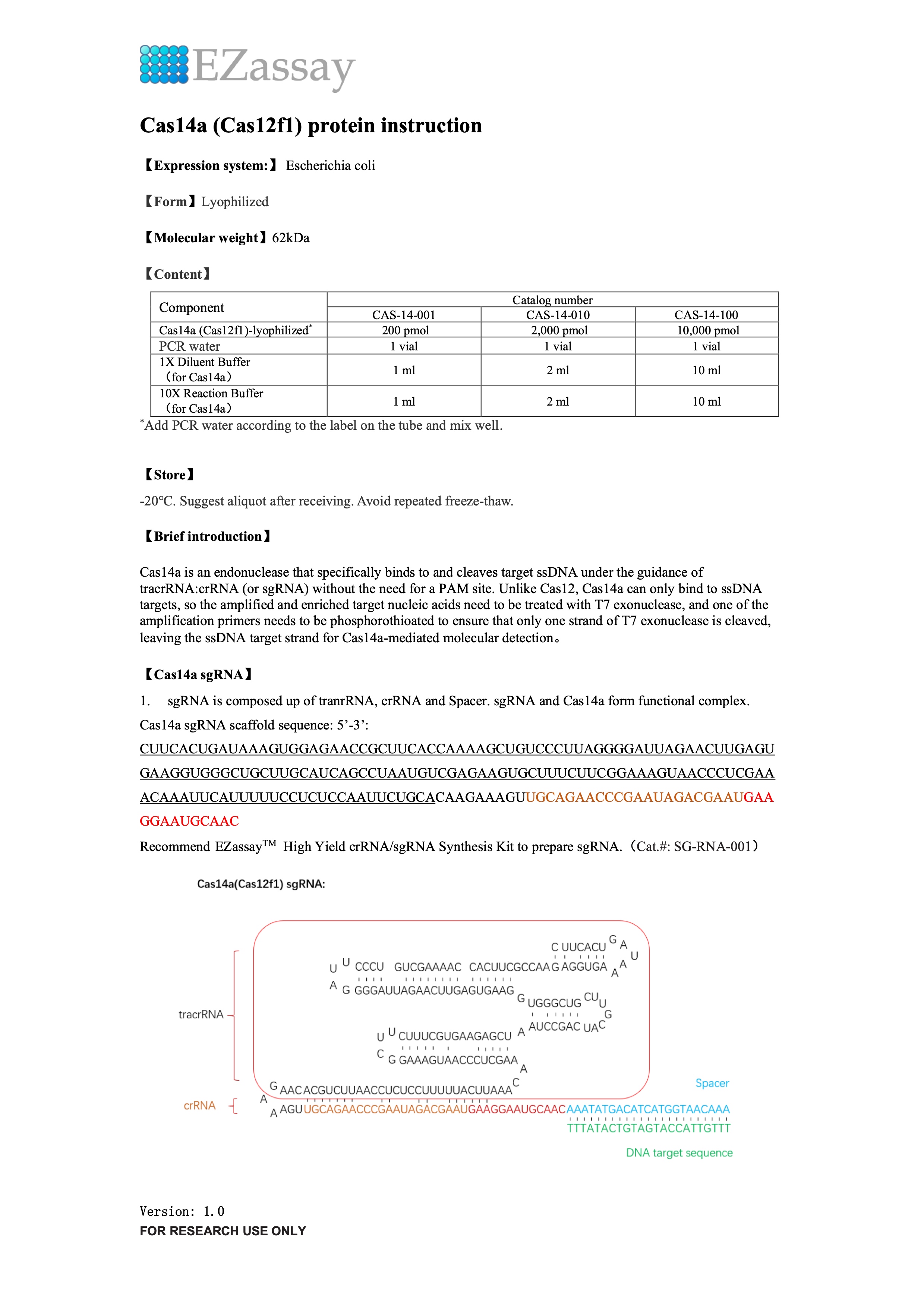 | Cas14a (Cas12f1)_100pmol | CAS-14-001 | 200pmol (10uM*20ul) | ₩550,000 | Cas14a is a very small Cas protein, about half that of other Cas proteins. Cas14a can recognize and cleave the target ssDNA, and also has co-cleavage activity. It can be used for the detection of ssDNA. Cas14 enables high-fidelity SNP genotyping. Since the recognition of DNA molecules does not depend on the PAM site, Cas14 has extremely strict requirements for the accuracy of the recognition sequence, and the mismatch of a single base will seriously inhibit its cleavage activity. |